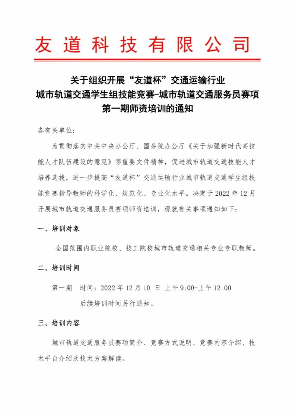 關(guān)于組織開展“友道杯”交通運(yùn)輸行業(yè)城市軌道交通學(xué)生組技能競(jìng)賽-城市軌道交通服務(wù)員賽項(xiàng)第一期師資培訓(xùn)通知